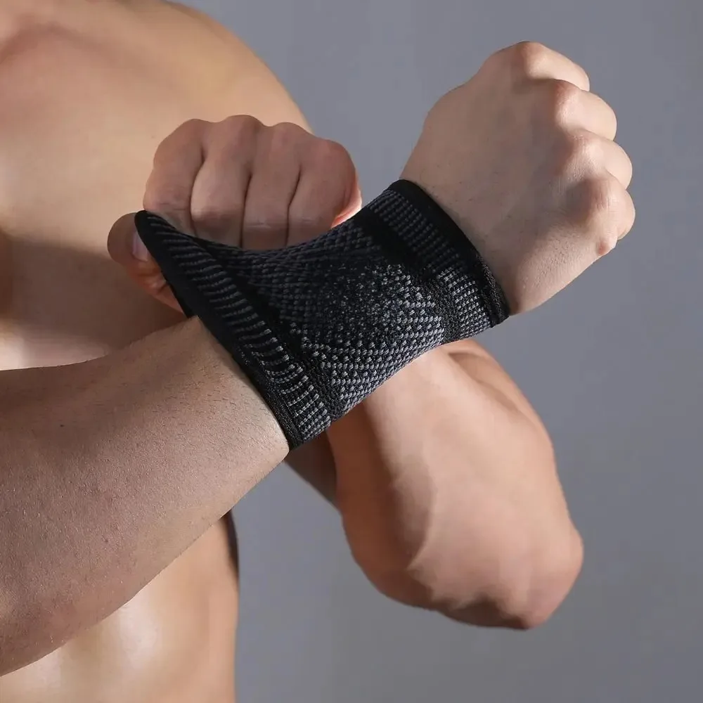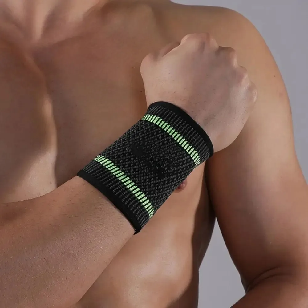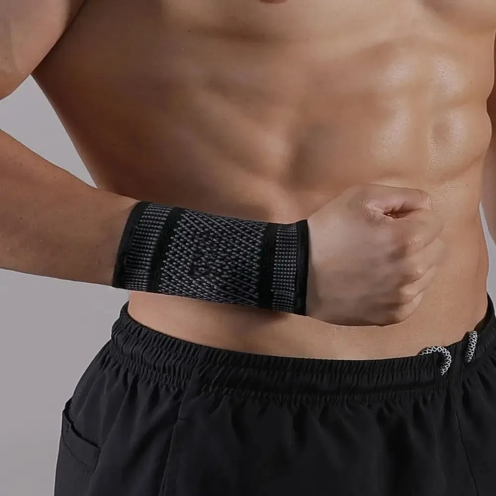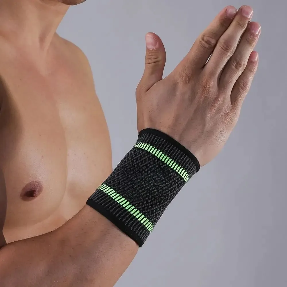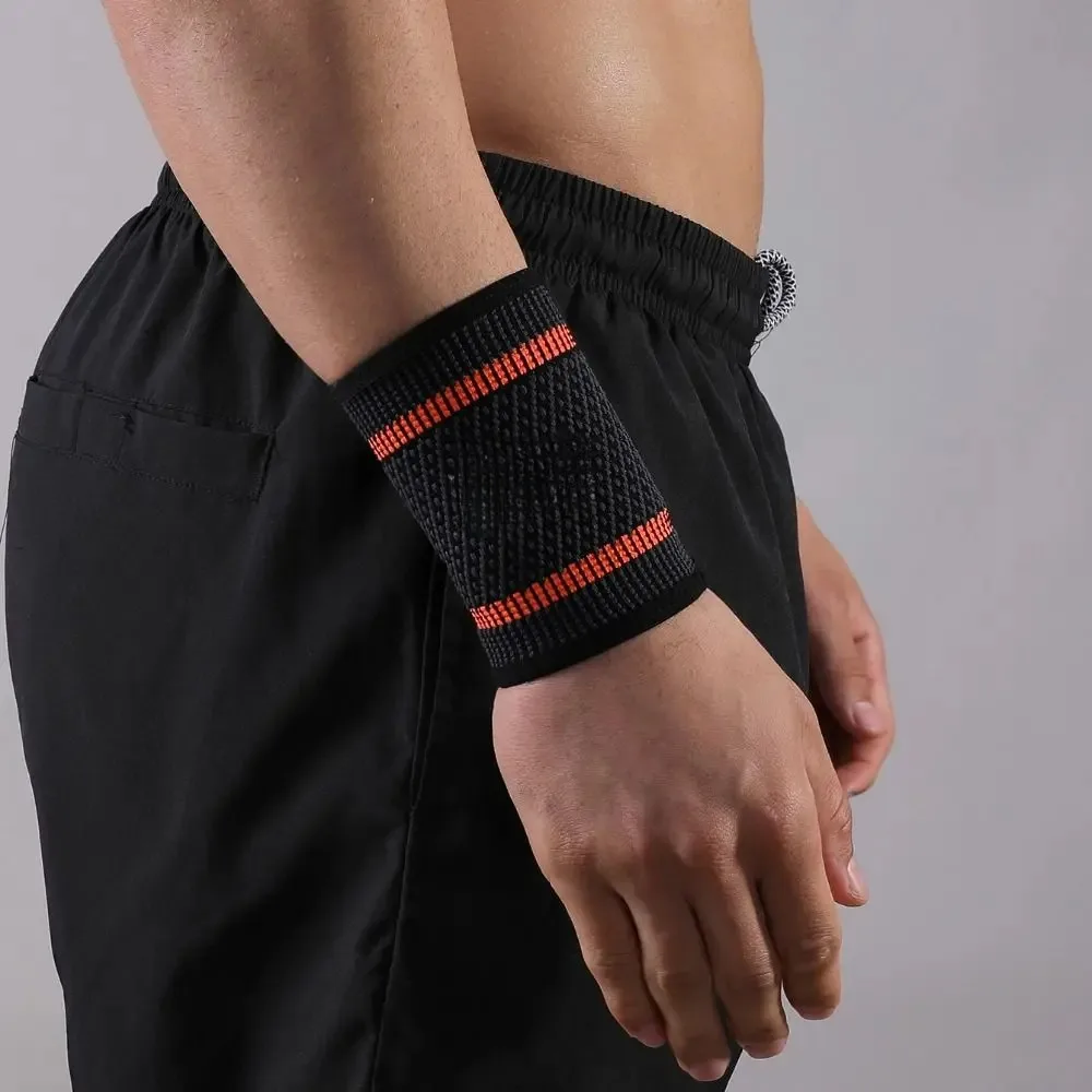 Faixa de suporte de pulso em nylon, resistente e eficaz na prevenção de lesões esportivas, ideal para tênis, badminton e levantamento de peso.